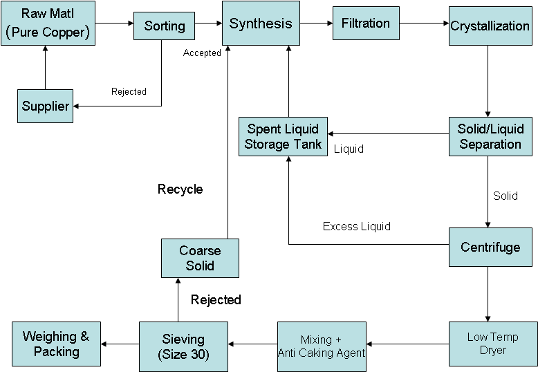 Pure Metallic Copper in wire form is oxidized at controlled temperature in the presence of dilute copper sulphate solution. The resulting intermediate copper ionic solution is subsequently oxidized by concentrated sulfuric acid. The oxidation performed in the controlled conditions, efficiently eliminating any impurity during the dissoultion. The process eventually generates a hot and concentrated copper sulphate solution. Upon cooling, crystallizing out copper sulphate pentahydrate, the crystals are then seperated from mother liquid by centrifugation and then dried, sized and packed. The mother liquid is then recycled and reused.